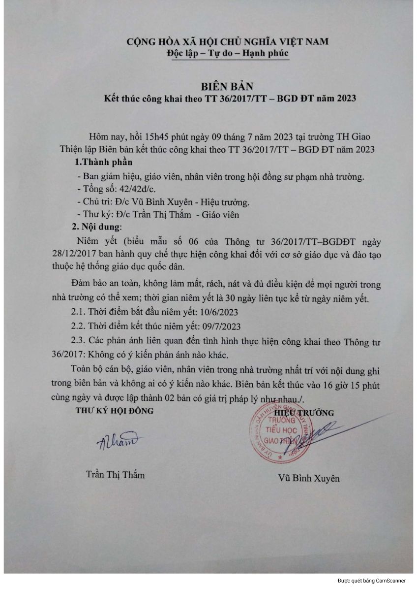 Biên bản kết thúc công khai thông tin chất lượng giáo dục Tiểu học thực tế năm học 2022-2023 theo Thông tư 36/2017/TT-BGDĐT