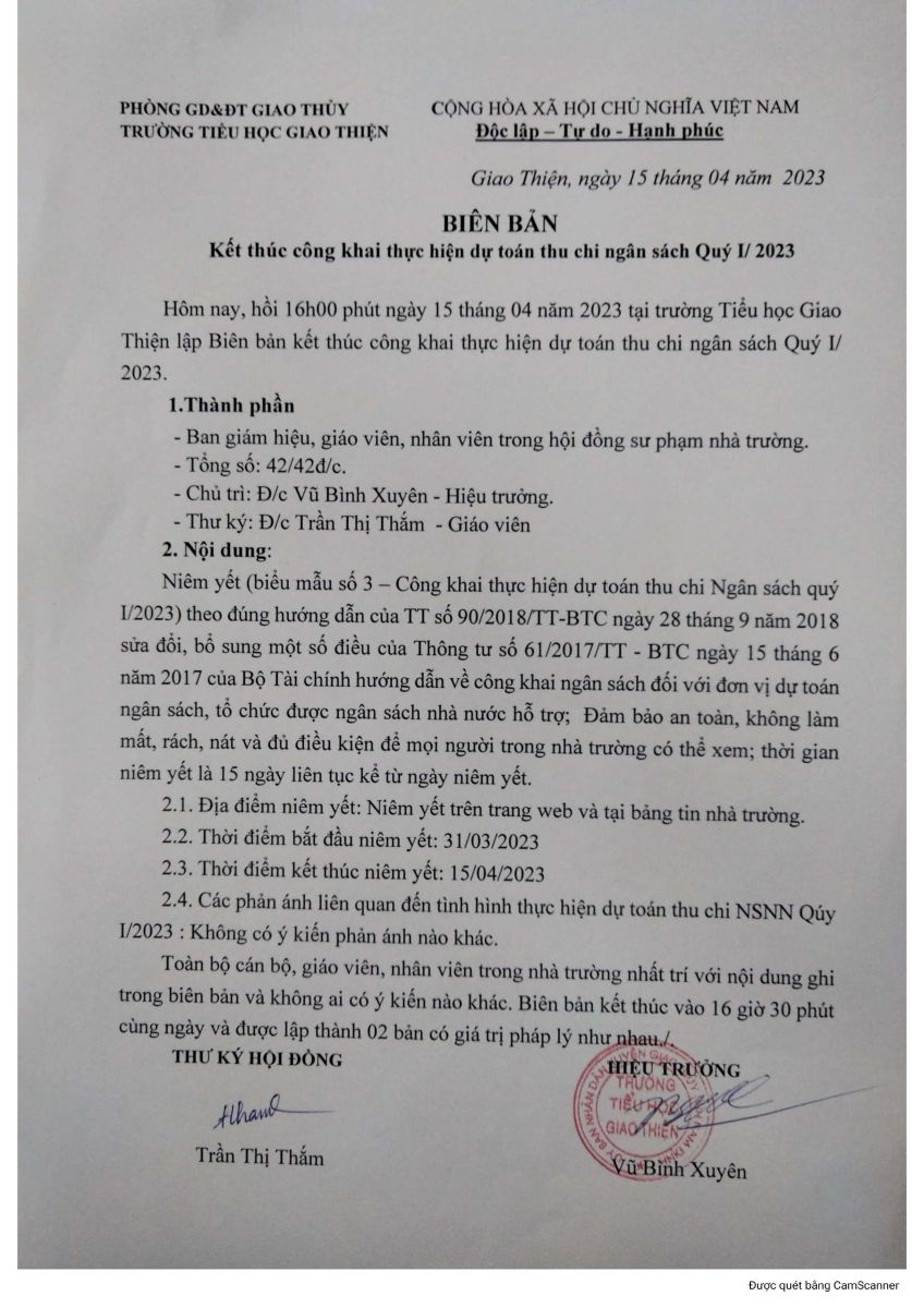 Biên bản kết thúc công khai thực hiện dự toán thu chi ngân sách quý I/2023
