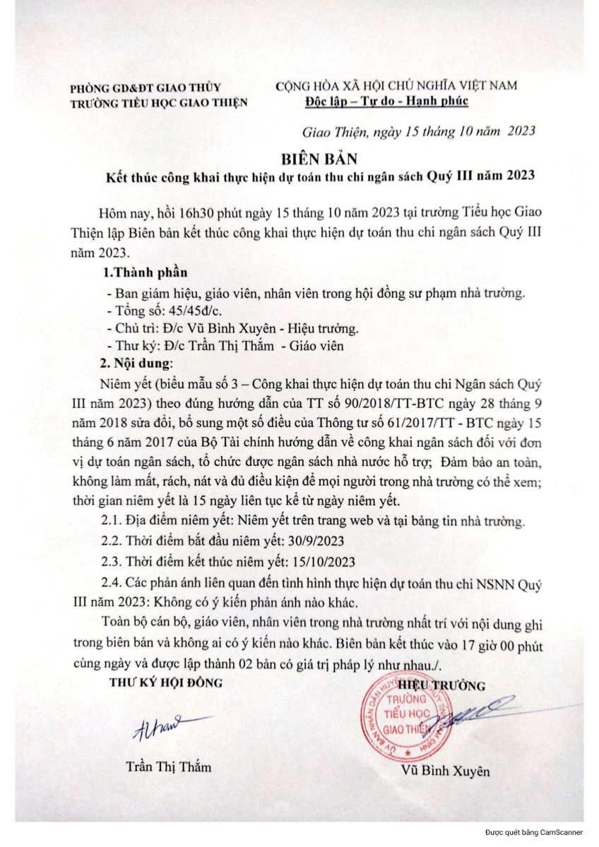 Biên bản kết thúc công khai thực hiện dự toán thu chi ngân sách quý III/2023