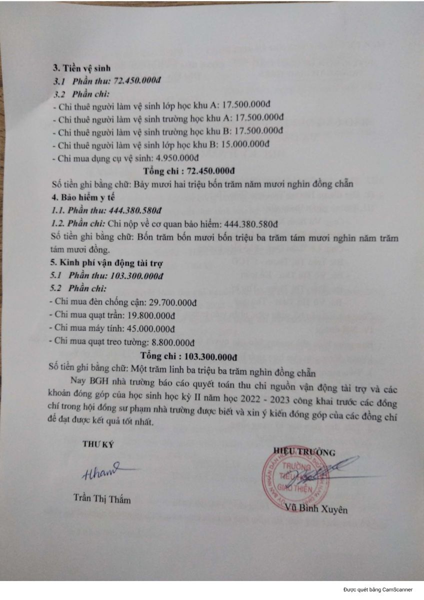 Công bố công khai quyết toán thu chi và sử dụng nguồn vận động tài trợ và các khoản đóng góp của học sinh học kì II năm học 2022 – 2023