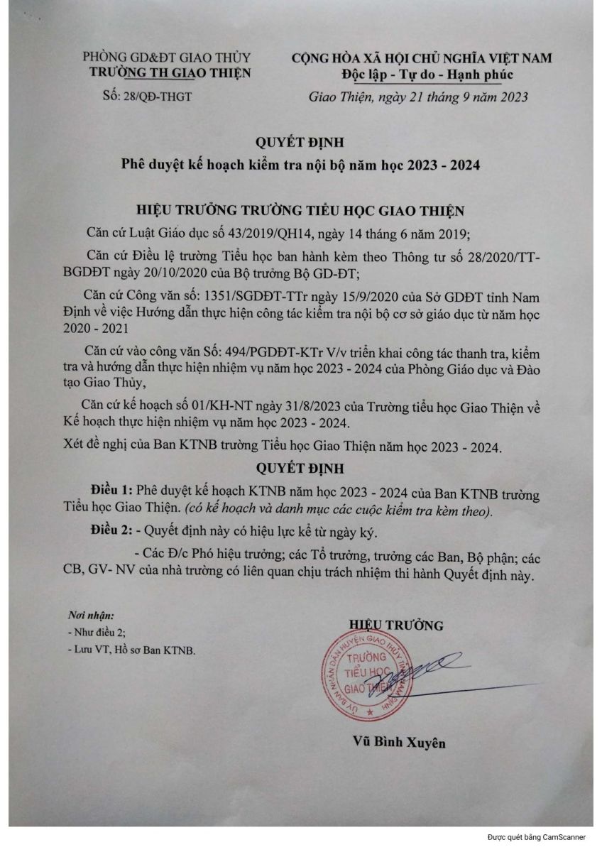 Công khai thành lập Ban Kiểm tra nội bộ năm học 2023-2024